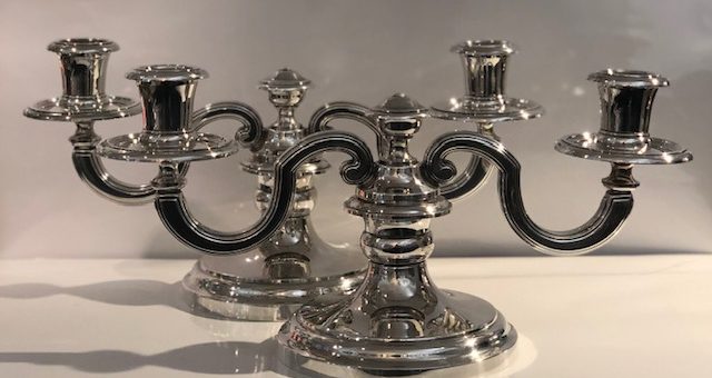 Jolie paire de bouts de table, Christofle, avec girandoles amovibles de 4 lumières chacune, transformant les chandeliers en bougeoirs.