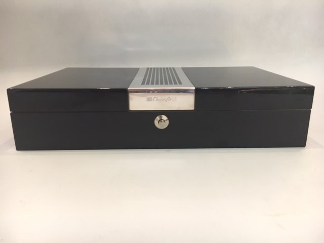 Le plaisir est au rendez-vous avec cet art de vivre : fumer le cigare, une habitude encore plus sympathique avec cette magnifique boite à cigares et son humidificateur, en laque noire et argent poli miroir, modèle América -art-déco- de l’orfèvre Christofle.