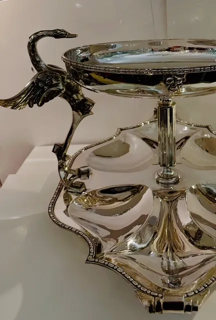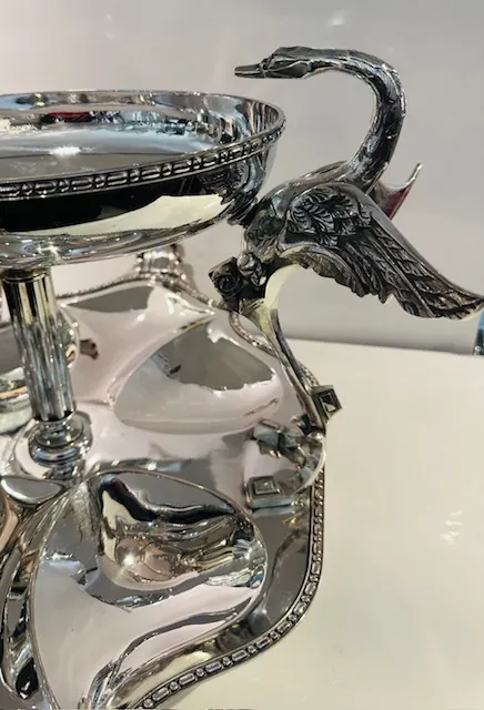 Ce joli plateau avec sa coupe soutenue par deux cygnes est probablement une pièce unique ou produite en série limitée.