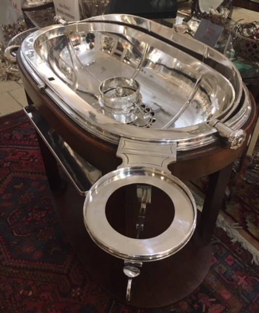 Cette table à boeuf se compose d’un support à couvert à découper, d’un support à assiettes rétractable, d’un réchaud et de deux récipients à sauce.