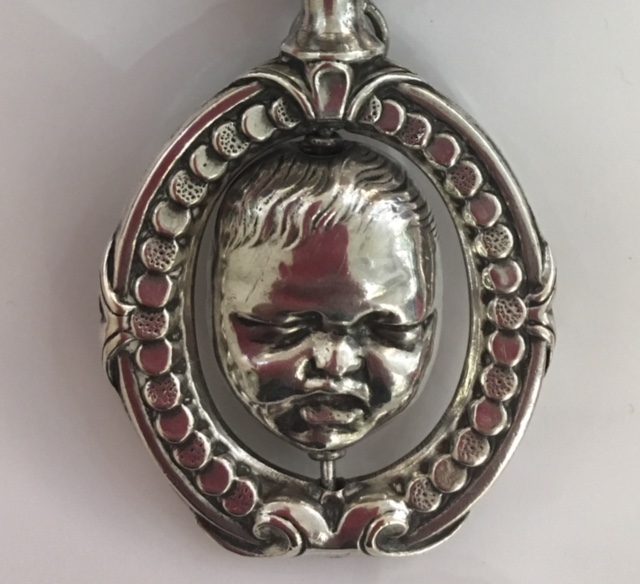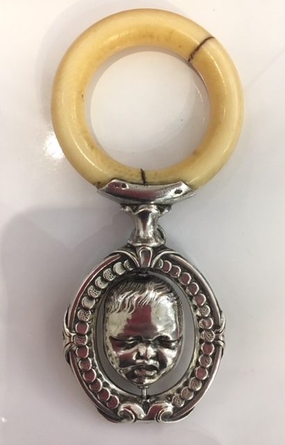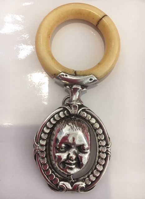 Joli hochet d’exception, double face tournante, Jean qui pleure et Jean qui rit, XIXème siècle, argent massif et ivoire.