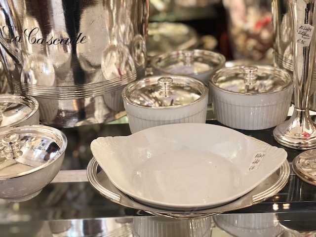 • 11 grands plats à gratin, ovales, en porcelaine et couvercles en métal argenté : 95€ pièce
