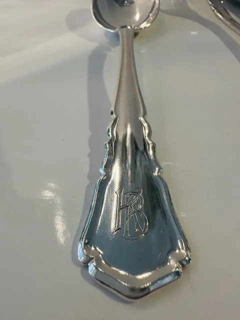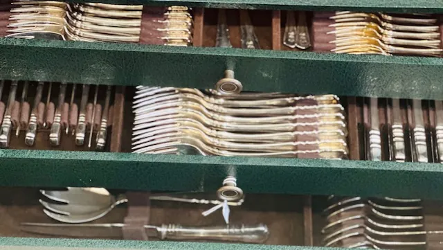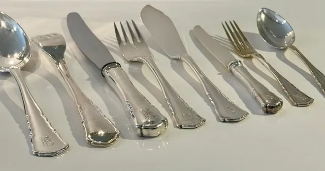 Couverts de table : 12 couteaux de table ; 12 petits couteaux ; 12 cuillères et 12 fourchettes de table ; 12 couteaux et 12 fourchettes à poisson ; 11 fourchettes à dessert ; 12 cuillères à café.
