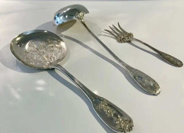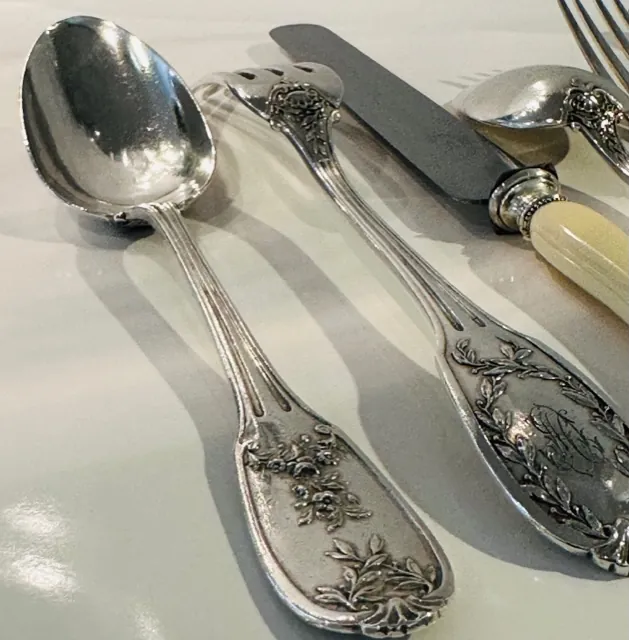 Très jolie ménagère, datant du XIXème siècle, en argent massif, poinçon Minerve 1er titre ancien 950/000, stylisant des fleurs d’églantine et des feuilles de laurier. Le tout ciselé avec minutie.
