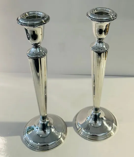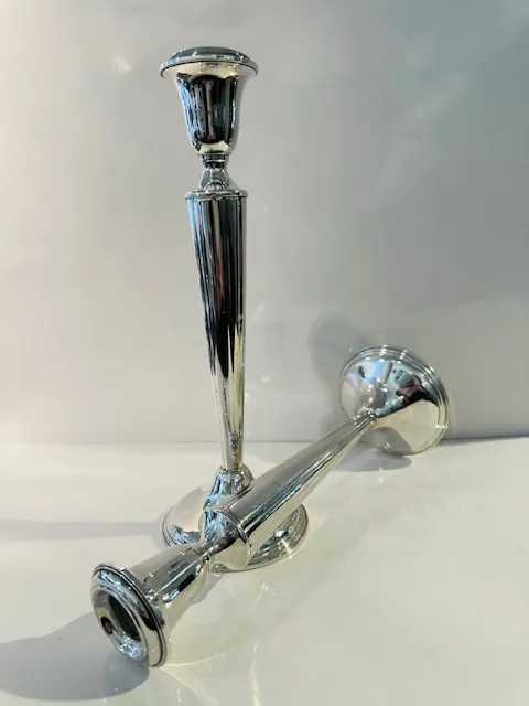 Ces bougeoirs, début XXème, ont un design contemporain de par leurs lignes épurées et leurs futs à pans coupés nous rappellent l’Art déco.