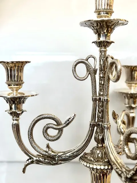 Exceptionnelle paire de candélabres en bronze argenté pouvant être transformée en bougeoirs.