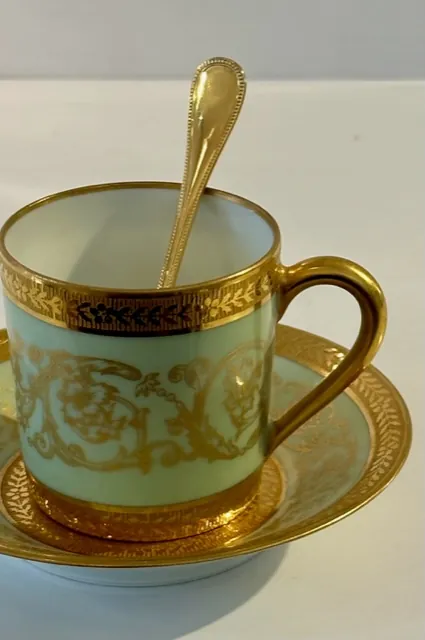 La blancheur de sa porcelaine est sublimée par le vert Céladon et des rinceaux à l’or fin.