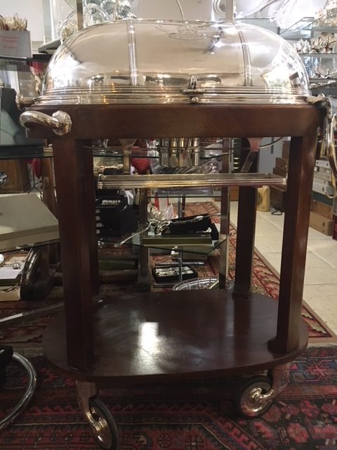 Très jolie table à boeuf, ancienne, en métal argenté, avec sa structure en bois teinté acajou, provenant de l’hotel d’Angleterre à Rouen.